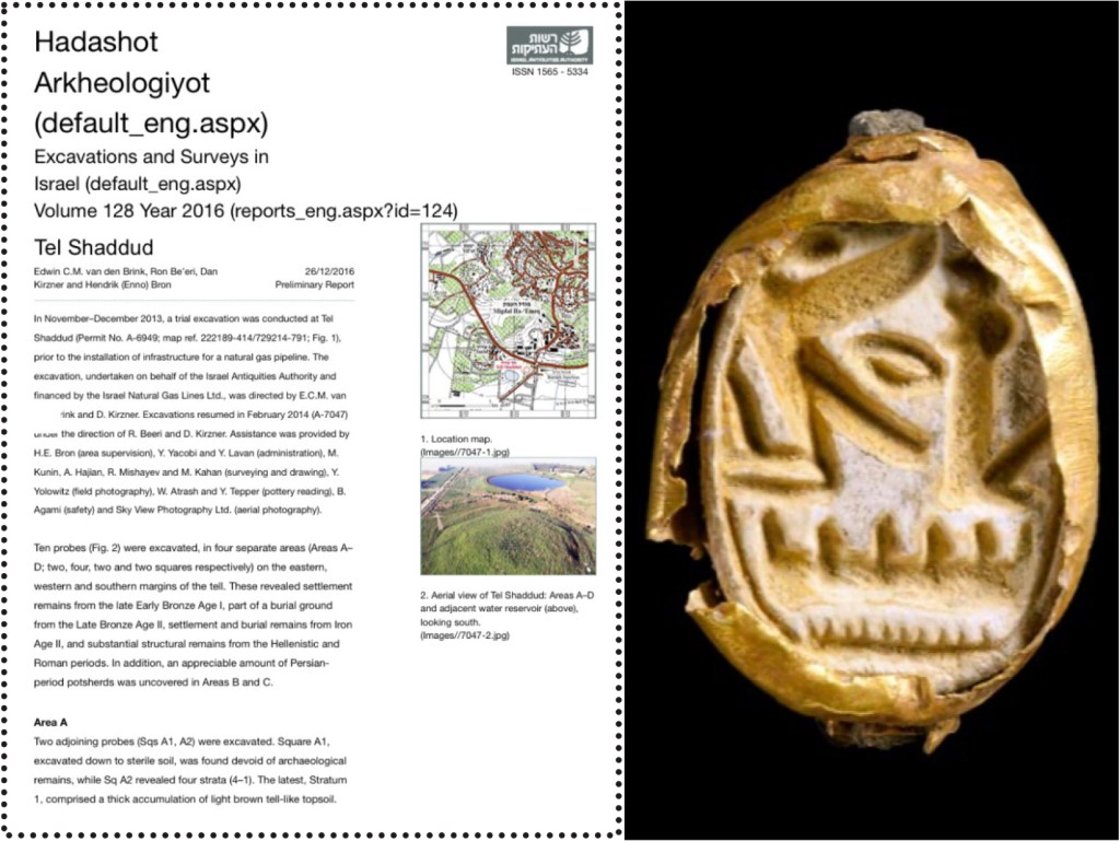 This article presents the preliminary findings from a 2013-2014 salvage excavation across four areas (A-D) on the margins of Tel Shaddud. A major highlight is the discovery of a Late Bronze Age II burial ground in Area A, featuring an anthropoid clay coffin with a scarab of Pharaoh Seti I, which suggests the presence of an Egyptian-style military garrison. The report also documents Iron Age II burials and mud-brick structures, Hellenistic building remains, and a Middle Roman agricultural complex containing stone vessels associated with Jewish purity laws.