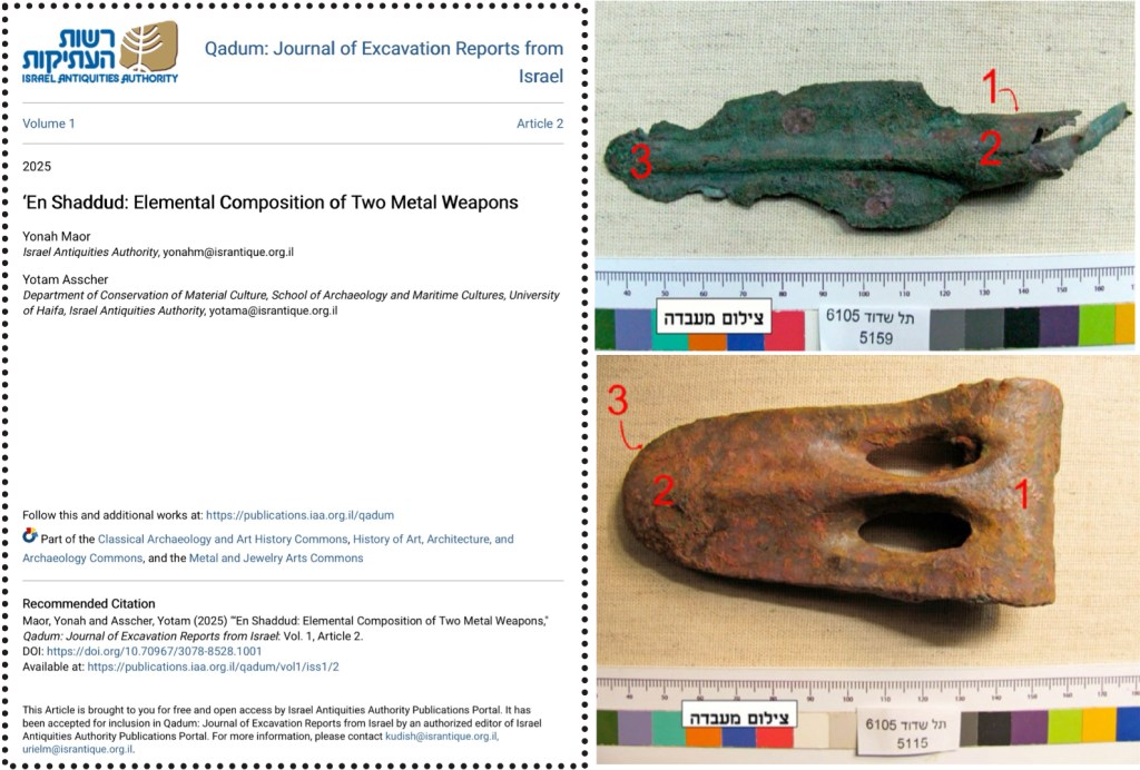 This study presents the compositional analysis of two Middle Bronze Age I metal weapons discovered in burials at Tel Shaddud – a socketed spearhead and a “duckbill” axe. Using X-ray fluorescence (XRF) analysis, the researchers identified both artifacts as made of arsenic-copper alloy, with notable variations in trace elements, including elevated lead levels in the axe. These findings provide new insights into Bronze Age metallurgy, demonstrating the technological skill and adaptive resource management of metalworkers in the northern Levant and enriching our understanding of Shaddud’s role within regional trade and production networks.