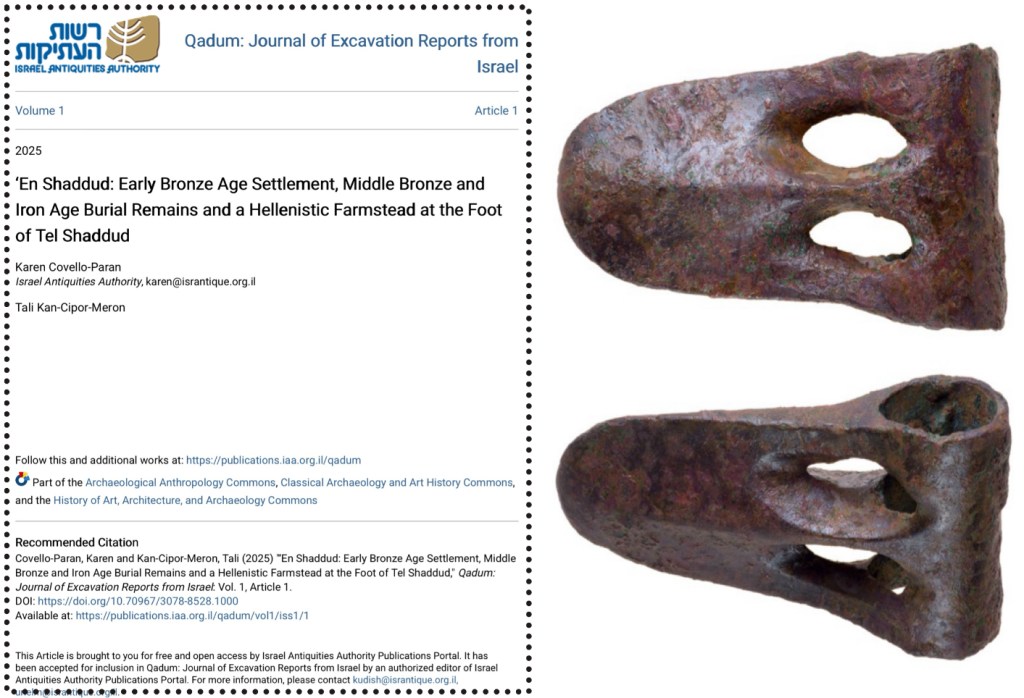 This article presents the results of excavations conducted at the foot of Tel Shaddud, revealing a sequence of occupation layers spanning from the Early Bronze Age to the Hellenistic period. The study identifies an Early Bronze I settlement, Middle Bronze “warrior” burials containing arsenic-copper weapons, an Iron Age I grave, and a well-built Hellenistic farmstead. Together, these discoveries illuminate the long-term development of settlement and mortuary activity around the spring of ‘En Shaddud and provide crucial evidence for the shifting landscape use of the Jezreel Valley over three millennia.